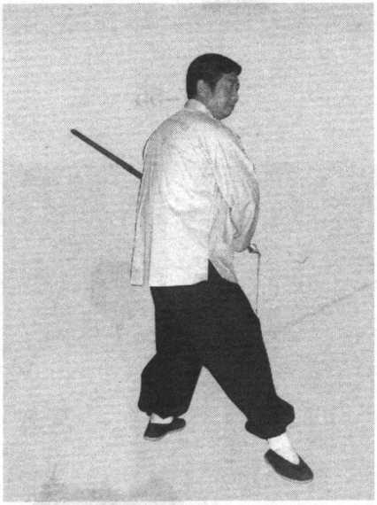 身体重心不变,左脚提起向身体左后(西北)方撤 步,左脚尖外撇,身体左转,随之右脚尖微内扣;同 时,右手握剑,由上向前下方推出,右手虎口向下,手 心向外;左手剑指由上向下、往左后展开,置于左胯外 侧,手心向下;眼视剑尖前方。(图1-59)