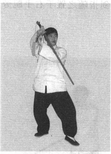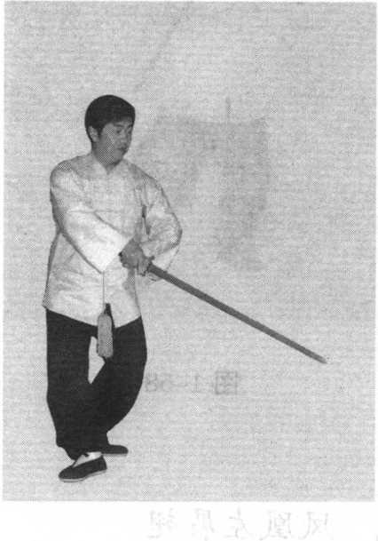 1. 身体左转,身体重心向后移至左腿;同时,右 手握剑,随右前臂外旋由上向下、往身体左后劈,手心 物 向里;左手剑指随之向前附于右手腕旁,手心向下;随 式 即身体微右转,右脚提起向左前(东南)迈出,脚尖外 太 撇成虚步;眼视前方。(图1-56)