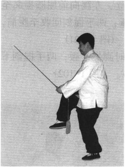 3. 右脚尖外撇,右腿直立,左腿向前屈膝提起至 大腿与地面平,脚尖自然下垂;两手握剑回收至腹前, 剑尖微向前下指;眼视前方。(图1-101)