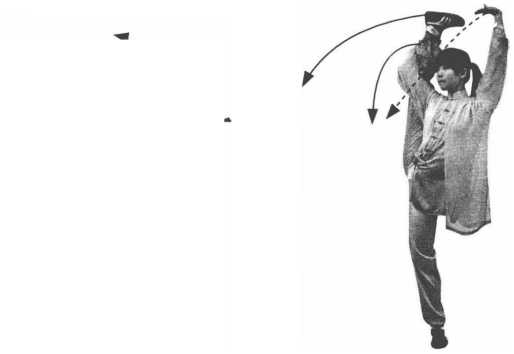 要点:上蹬腿要在肩后垂直于地面,两腿膝关节不能弯曲,上 体不能含胸弯腰。顶头直立,平衡静止不能晃动。此动与上一式要 环环相扣,连贯顺遂。
