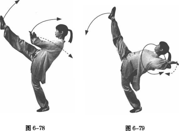 ②重心保持平衡,上体后仰接近水平。左腿独立支撑;右腿直 膝前举接近垂直,右脚面绷平,脚尖斜向上。同时,两臂随体向左 右两侧分展,与肩成水平,两掌心向上。下颌微收,目视右脚尖。 (图 6-79)