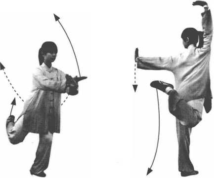 要点:转身时通过顶头、拧腰,旋髓发力,转动圆活、连贯, 支撑脚不能摇摆、跳动。从第28式至第33式的平衡动作,难度 大,动作连贯,环环相扣,要求练习者有很好的柔韧性和平衡能 力,动作一气呵成。