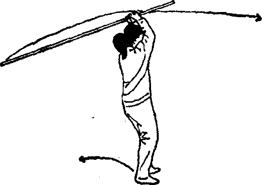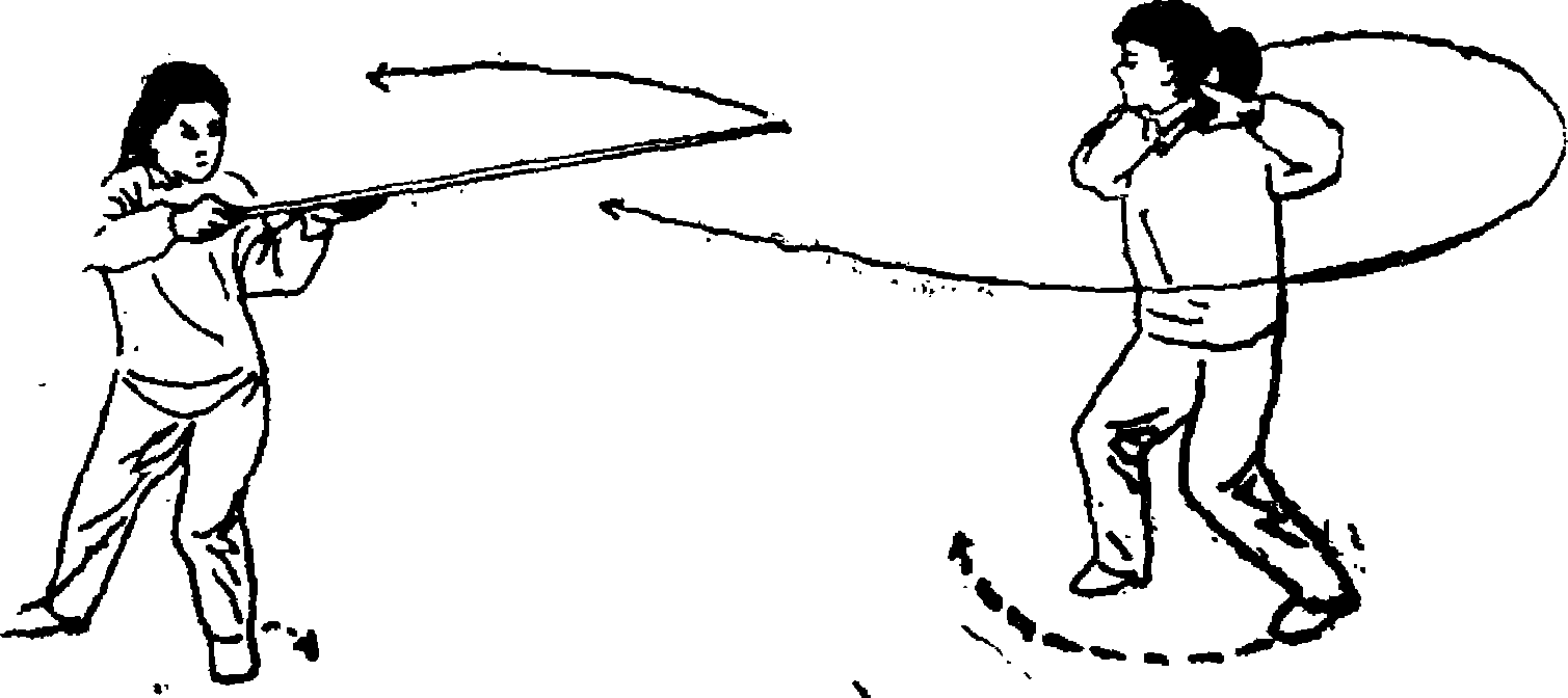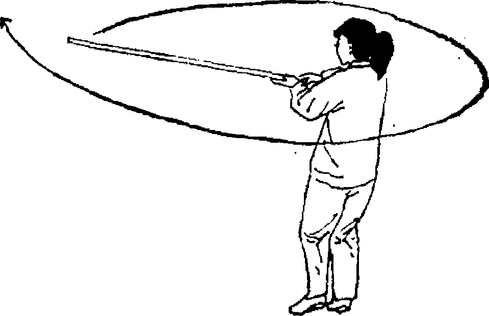3. 身体右转,左脚向右脚靠拢,脚跟抬起.两腿微 麹3双手持棍向左、向前平抡,棍与胸平$目视前方(图 12).