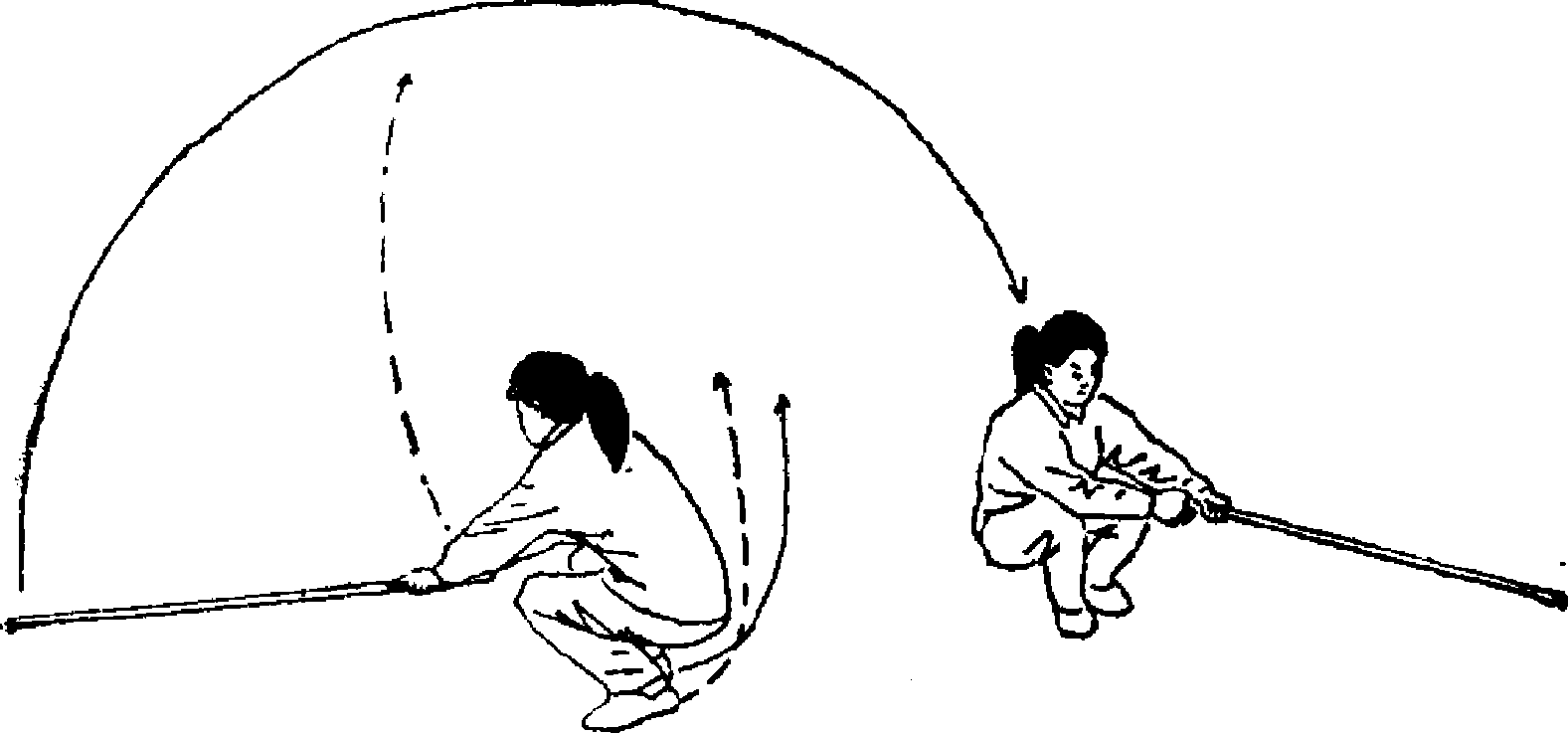 痕屈膝稍分开下蹲;双手持棍随转休向右下平扫.两臂伸 直;目视棍梢前方(图15及反面图).