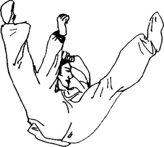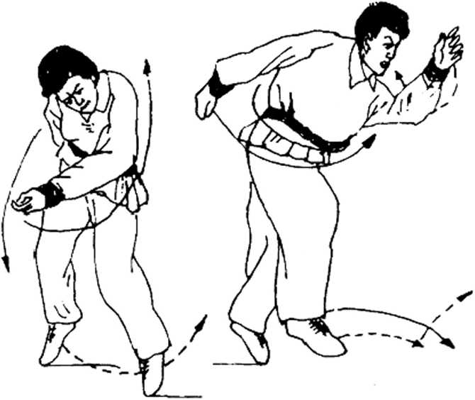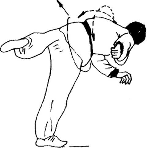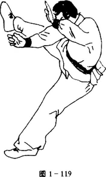 ' 上动不停(图1-119),头向左转,左手由前向左,向后上 方使劲反挥,身体随同向左后上方拧转,同时右脚猛然蹬离地 面,并在空中做里合腿动作。