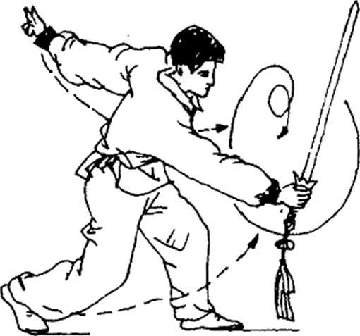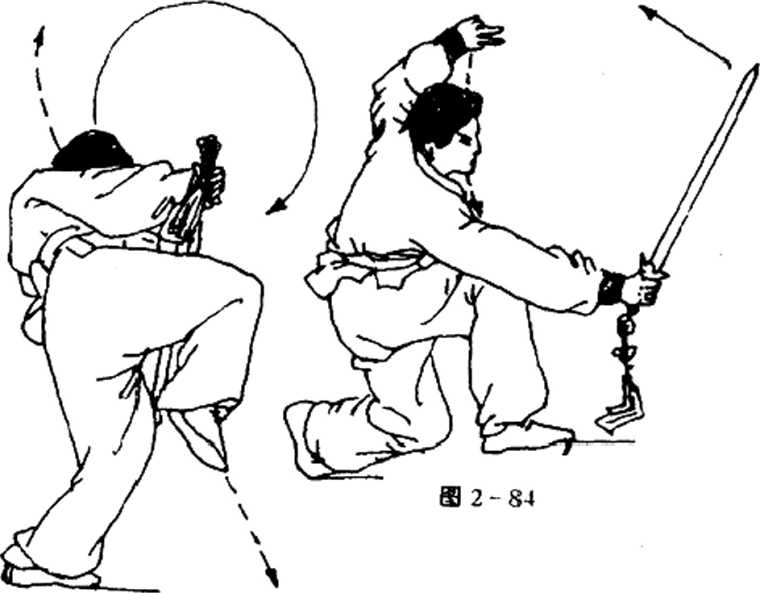 27.浪步斜募剑演练者头转向前方,左脚向前上一小步,收腹,身体猛前 倾,同时右手持剑向前斜下劈,左手随体前倾反拉至体后上 方,剑指朝后,目视剑身(图2- 82)。@3 2-82右手内卷腕(图2-83),做正挽花行剑一周,同时重心左 前移,右脚顺势提离地面,左手前行护于右腕内侧,剑倒提于 右手,剑尖向下,目藐视前方C上动不停,右脚向前落步,体前倾,同时右手持剑,使剑身 由下向后、向上,再向前劈出。左手护腕随行,至剑向前劈时 向后上方架隔,臂微弯,剑指朝前,右膝前顶,左腿反跪于地上 成麒麟步,目视前方(图2 -84)。图 2-83