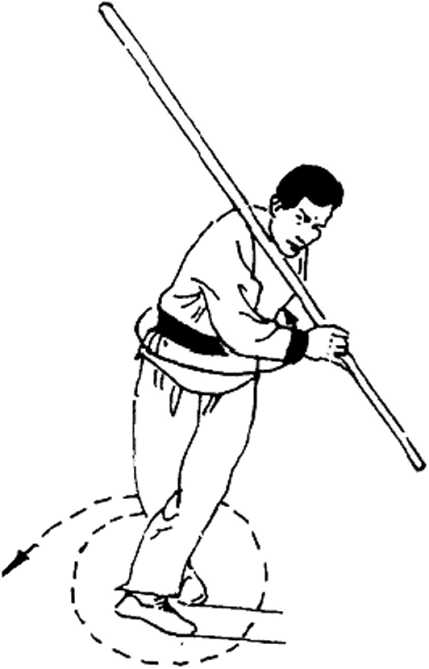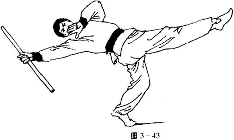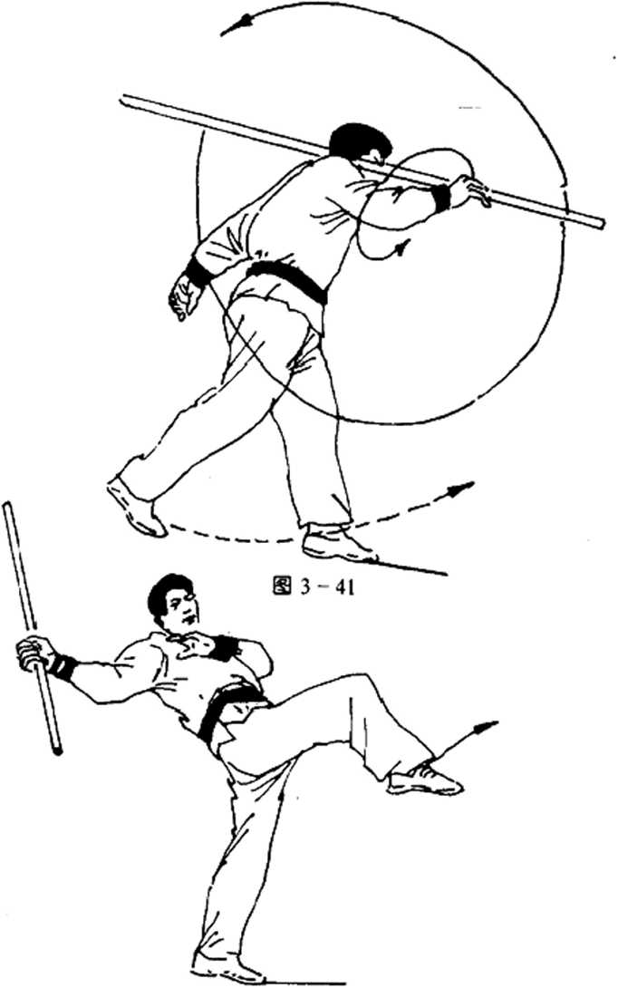 如图3-42所示,右脚向前翘起,准备侧摔,右肩往左略 闪,使棍由肩上落下,右手同时向后、向下、再向前,向上撩起 根头,使棍头与地面成一立圆绕行一周。左手自然往胸前上 摆,准备倒地时保护自己。目侧视后方。