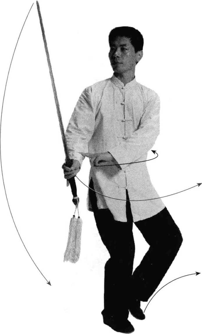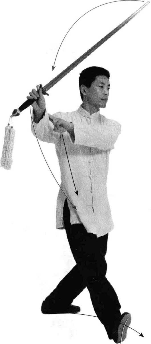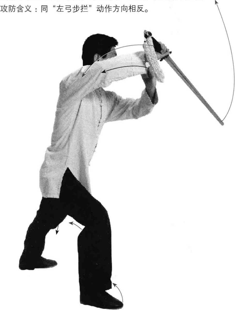 :落右脚,屈右膝,重心向右腿平移,蹬左腿,成 右弓步;同时上体右转,右手持剑继续立圆沿弧线拦剑,提剑把,剑 尖斜向左斜下方,剑身拦于左肩前方,力达剑身中段,左手剑指附在 右手小臂内侧;目视剑身中段前方。要点:以上两动要连贯,剑必须走一大圈,视线随剑移动。21 .左弓步拦(迎风捏尘)①接上动,屈左膝,重心平移向左腿,蹬右腿,右脚脚尖上翘 且微外摆;同时右手持剑继续沿弧线上架于右额斜上方,左手剑指附 在右手小臂内侧;目视左前方。②丁步坐剑:上体右转,右手剑立圆沿弧线向侧后方,坐剑把 于右腰侧后方,剑尖朝上;目视剑身中段。
