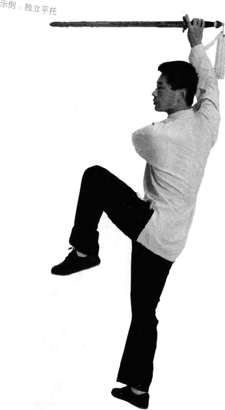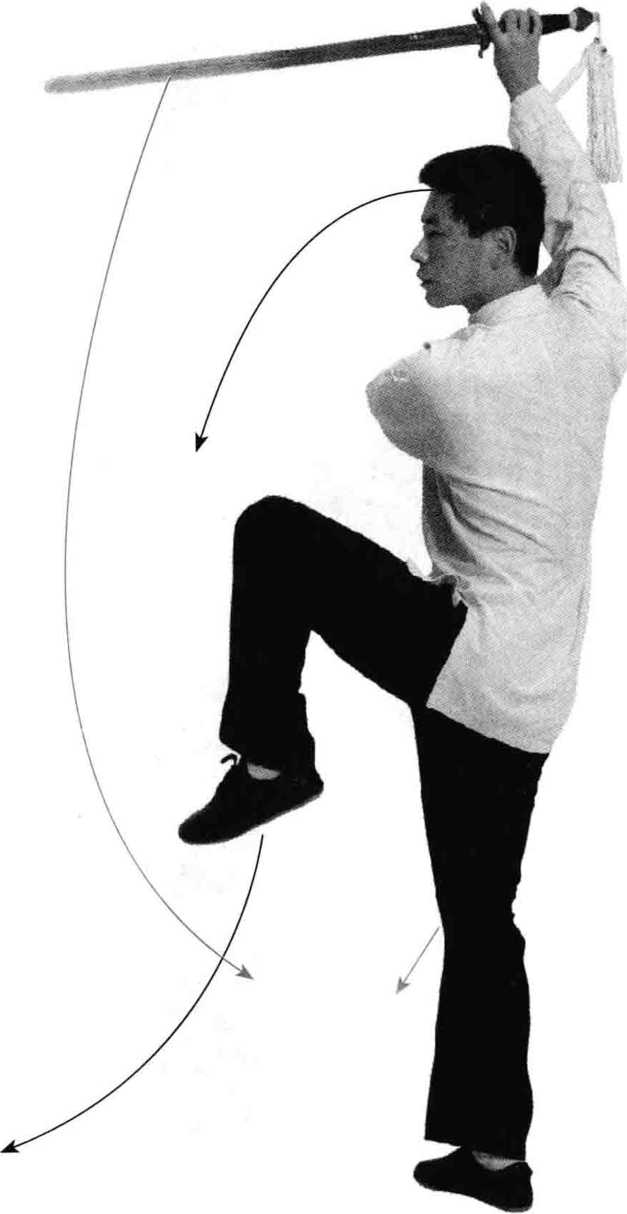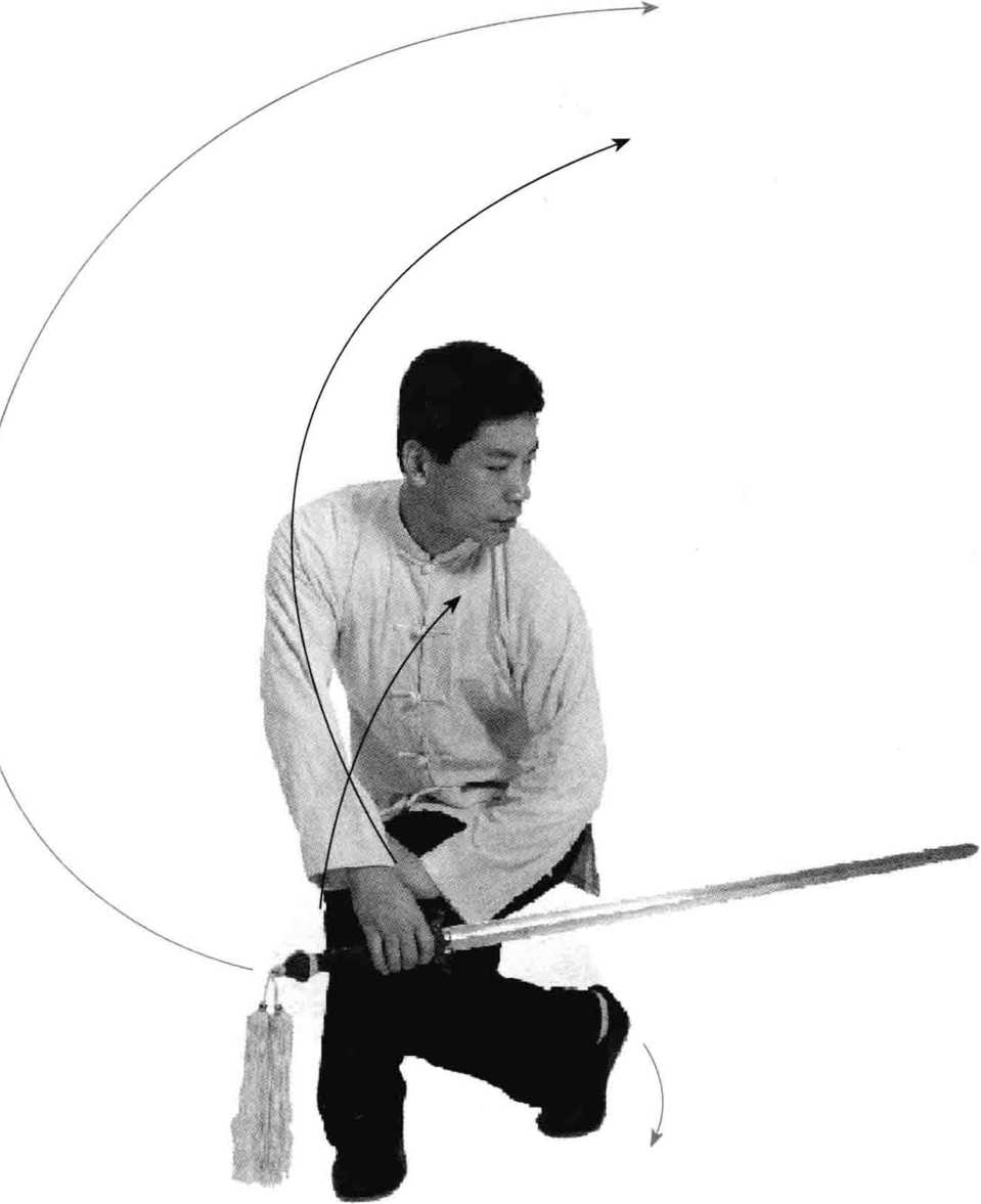 为立刃剑法。右手握剑抡转后,将剑身纵向立刃向上平举,至右 额上方,剑身与地面平行,劲达剑身的下刃中段。曲11.挂剑为立刃剑法。剑尖由前向下,再向后立圆穿绕。