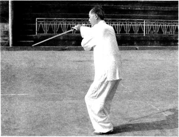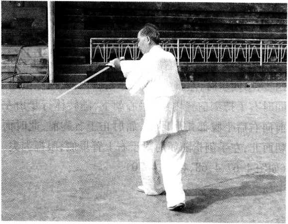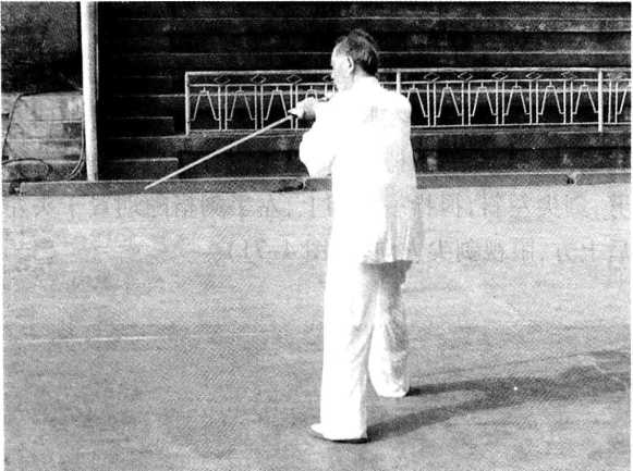 动作:上身右转,右脚、左脚依次向后东北方行进 四步,第四步时,左脚尖点地,于右脚内侧,两膝微屈。 同时右手持剑前臂内旋,手心朝下,随转体行步由左 前向右后平腹部弧形回扫,屈肘止于右胸前,此时面 朝西北,左手剑指随屈肘附于右上臂里侧,眼视剑尖。 (如图 4-67.4-68.4-69.4-70)