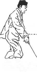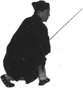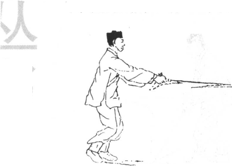 剑回抽同时完成,不能有先后之分。腰下沉时向 右拧劲,两腿须盘紧,上身胸要挺,背要直,两 肘要屈。
