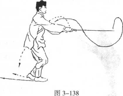 3. 上动未停,紧接身体向下沉,身 体重心后移,右脚向前进一步,脚尖向 夕卜,踏实,膝微屈;同时,右手持剑向 外翻转臂腕,手心向上成仰手平剑“太 阳剑”势,向怀中抽带置于小腹前;再 向下坐腰,左脚速跟步至右脚后,脚掌 着地,膝微屈,身体重心落于右腿;同 时,右手持剑速向下翻转臂腕,手心向 下成俯手平剑“太阴剑”势,随左脚跟 步时,身上起长腰进身向前平刺,臂伸 直,剑柄与胸平齐,剑身平直,剑尖向前;左手剑指仍附在右手腕上,手心向 下,随剑后抽,两臂屈圆,随剑前刺,两臂伸直,眼视前方(图3-138)。
