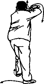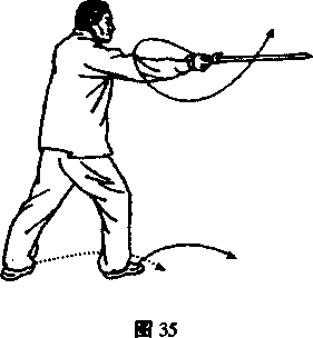 右足抽出向前(东)落成右弓势,同时上身略后仰(给剑让 路),右手腕逆转在额上抖一 “云顶”剑圈。终了势阳手剑把, 剑尖指向正东;左戟指上扬至左额前。(图35)