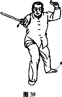 (2)向南劈平:里扣左足,向北上右足再上左足成左弓势; 同时逆挽左旁花以逆手剑向北撩,身向右转,左足里扣,转过身 来右足向南,成右弓势;同时右手剑随即以顺手剑由上向南劈 平;左戟指手心向上搭于右小臂,随即向上翻停于左额前。目前 视剑端。(图38、39)