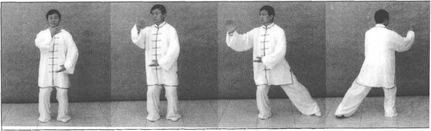 接上势,身体向左转,左脚全脚掌踏实,重心移于左腿。随体转,左掌向上经面前 向左前侧划弧,逐渐翻转掌心向外,掌指向,腕与肩平;右掌向下划弧至左肋前,掌心 逐渐转动向上,掌指向左,同时右脚提起向左移靠,前脚掌踏地;眼视左手方向。(图 5-428.图5 —429、图5—430)