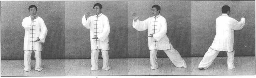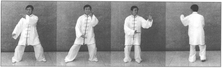 接上势,身体向左转,左脚全脚掌踏实,重心移于左腿。随体转,左掌向上经面前 向左前侧划弧,逐渐翻转掌心向外,掌指向,腕与肩平;右掌向下划弧至左肋前,掌心 逐渐转动向上,掌指向左,同时右脚提起向左移靠,前脚掌踏地;眼视左手方向。(图 5-422、图5-423、图5—424、图5—424背面)