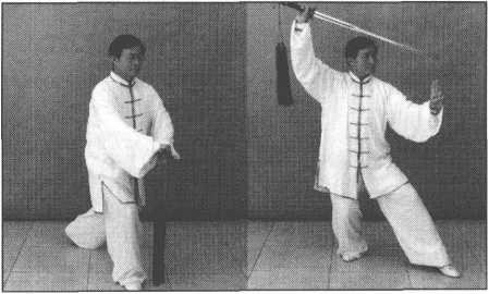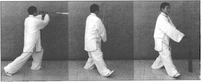 此动作腰雕的转动,带动身体右转, 宜。随体转,身体重心右移,左脚顺势向前迈出,是顺势顺向。如果转脚的角度太大, 虽然左脚也可以迈出,但是髓关节打开的幅度大,出现搦裆的现象,右膝关节极易受 伤。虽然顺向,但不顺势。此外,右手撩剑动作要与左脚的踏地同时到位,加强撩剑的 力度。身体中正,松肩沉肘,双臂撑圆,剑尖低于剑把。