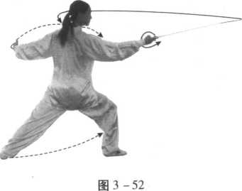 ② 转体、侧弓步与两手分展击剑要协调一致,击剑是用剑 的前端击打,力贯剑身前端,本式是反击剑,右手仰握剑由左 向右击打,要在上体右转带动下,将剑向上方击出,要求以身 带剑,身剑协调,舒展大方。