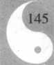 剑法:右手握剑向右后方斜削击出,高与头平,左剑慎向左下 方分开平展,剑指略低于肩,手心向下。
