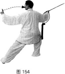 动作:接上势。身体向左转,重心在右腿; 右手握剑保持上势姿势不变;左手剑指随体转经 下颌前向体左前展臂前指,掌心向左,剑指向 ±;眼视剑指方向。(图154)
