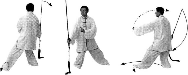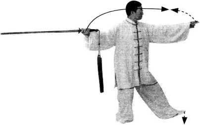 【要领】重心向前送时,顺势引剑,动作幅度不可太大;左脚后撤要灵活;腰髓要 99 和顺,随腰的转动双手同时向两侧平展。