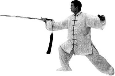 【要领】右手剑向前撩出,右肩顺势向前微送肩,剑尖不可触及地面;腰髓要和顺, 弓步、撩剑、左手剑指动作要同时协调完成。
