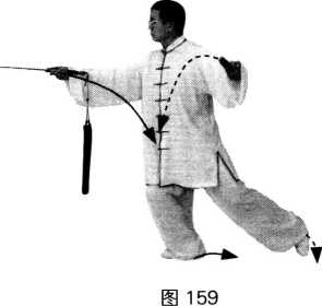 动作1:接上势。身体微向左转,重心在右腿,左脚提起向后撤步,前脚掌踏地; 同时,右臂展伸向前引剑,腕与肩平,手心向右,剑尖向前;左手剑指随体转微向外平 撑,腕与肩平,手心向外,剑指向前;眼视引剑方向。(图159)