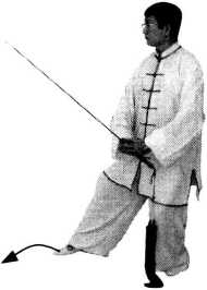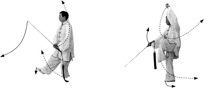 【要领】右脚尖内扣、左手剑指、剑尖上挑动作要以腰的转动为主;剑尖上挑的方 向应在右后45。。