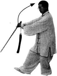 三、第四十九式左跨拦动作1:接上势。身体向左转,重心移至左 腿,右脚提起向左脚前盖步,脚跟先着地,脚尖 外展,两腿交叉;同时,右臂内旋翻转,右手剑 剑尖自右而上经面前平剑身向左前下刺出,腕与 腹平,手心向下,剑尖向左下;左手剑指向上经 面前划弧落于右手腕部,手心向下,剑指向右; 眼视刺剑方向。(图174)【要领】重心左移时左腿要屈蹲,然后右脚 再提起向前盖步,两膝关节交错相抵;立身中 正,双臂撑圆,松腰坐髓;右手剑的剑身要与右动作1:接上势。身体向左转,重心移至左 腿,右脚提起向左脚前盖步,脚跟先着地,脚尖 外展,两腿交叉;同时,右臂内旋翻转,右手剑 剑尖自右而上经面前平剑身向左前下刺出,腕与 腹平,手心向下,剑尖向左下;左手剑指向上经 面前划弧落于右手腕部,手心向下,剑指向右; 眼视刺剑方向。(图174)【要领】重心左移时左腿要屈蹲,然后右脚 再提起向前盖步,两膝关节交错相抵;立身中 正,双臂撑圆,松腰坐髓;右手剑的剑身要与右图174图174脚上下相对。动作2:身体向右转,右脚全脚掌踏实,重心移至右腿,左脚提起向左侧前迈出, 脚跟先着地;随体转右手握剑向上经面前向右抽举,右臂外旋,剑尖在头前顺时针云 抹,剑身平举,腕与头平,手心向内,剑尖向右;左手剑指随体转仍附于右手腕部;眼 随体转向前平视。(图175、图176)脚上下相对。动作2:身体向右转,右脚全脚掌踏实,重心移至右腿,左脚提起向左侧前迈出, 脚跟先着地;随体转右手握剑向上经面前向右抽举,右臂外旋,剑尖在头前顺时针云 抹,剑身平举,腕与头平,手心向内,剑尖向右;左手剑指随体转仍附于右手腕部;眼 随体转向前平视。(图175、图176)