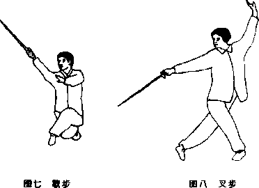 对剑的各种步法均要求是,做到迈步轻快灵活,落步稳 健,前进后进,虚实分明。前进时,脚跟先落地;后退时,前脚 学先着地。不可呆滞,步型的大小要适度,太大则影响灵活, 太小又不能练出功力。膝部要放松,不能僵硬。