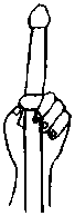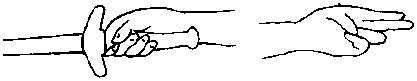 在练剑的过程中,多以左手握成剑指,剑指的作用是以助 剑势。在实际运用中尚可以剑指扰乱对方眼神,分散对方的 注意力。剑指的提法是,中指与食指伸直并拢,其余三指屈干 手心,拇指压在无名指第一指节上(图十二)。