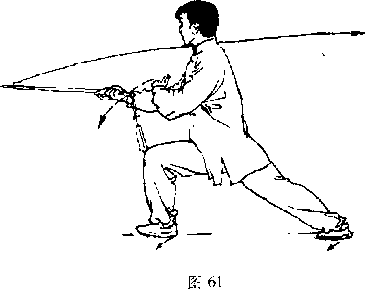 前摆举,腕同胸高,手心朝上,剑身平直,剑 尖朝前;左手剑指向下,屈肘附于右前臂内 侧,手心朝F;目视剑尖(图6i)c