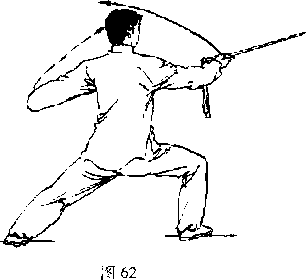 2. 随身体重心后移,两脚以前掌为轴碾 步,身体右转(约9 0。)成右横弓步;同时右手 握剑屈肘经胸前向右摆斩剑,微屈,手心朝 上,剑尖略高于腕;左手剑指向左分展侧举, 与腰同高,臂微屈,手心朝外;目视剑尖(图 62)。