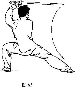 3 .重心左移,成左横弓步;上体略左 转;同时右手握剑屈臂上举,带至头前上方, 手心朝内,剑身平直,剑尖朝右;左手剑指向 上摆举,附于右腕内侧,臂呈弧形,手心朝 前;日视剑尖方向(图6 3