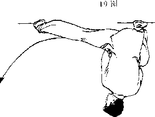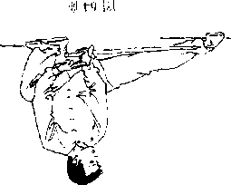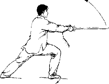 1. 左腿屈膝半蹲,右腿屈膝向后落步成左 ,j步;同时上体上转,随转体右手握剑弧形币时本
