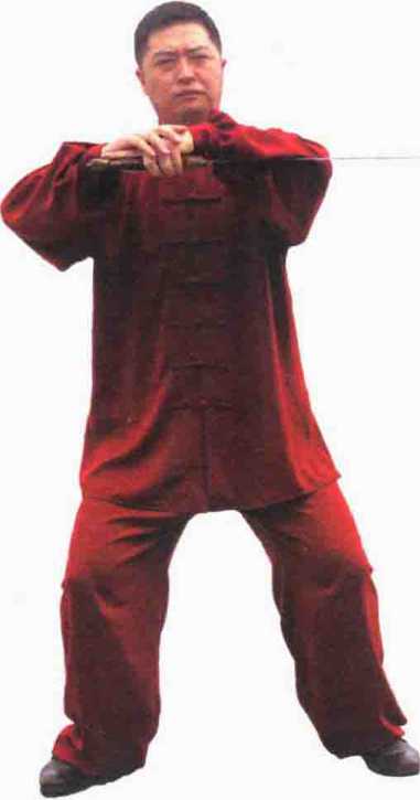 接前势,两腿慢慢弯曲下蹲,成马裆步。右掌向左,左 掌向右,两掌相抱成拳;左手持剑在外;右手用掌心贴左手 上,掌心附在左拳拳背,大拇指在下,五指自然撞开向左, 虎口在下,两手抱制亍礼;两眼向正前方注视(图5 )。【要点】动作要缓慢、协调、松柔;要劲从背后腰脊向 前运到两臂,身躯要正直,不能前俯后仰,保持虚领顶劲、 含胸拔背。图5