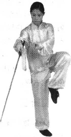 ③ 定势时右脚支撑腿站立要稳,左腿 屈膝高提,小腿内收,脚尖内扣,上体转 向西南,略向前倾,点剑方向亦为西南。