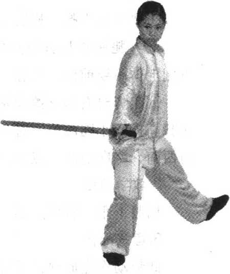 ② 左腿屈膝扣脚与点剑要协调一致, 点剑上体不要前俯,提膝不要开裆太大。