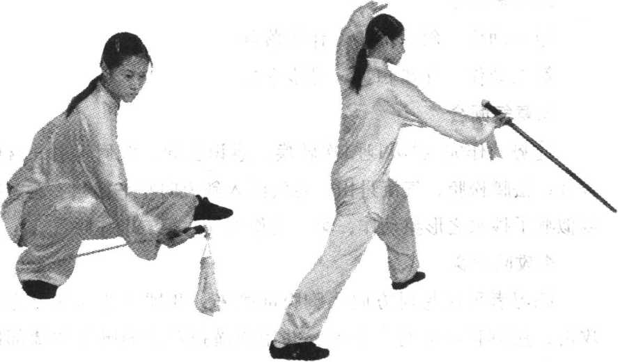 练习者可设想对方向我胸腹部刺来,我即下势闪开对方的 攻击,用剑指反插对方下部,并用剑横扫对方的脚踝和膝部以 及胸腹部。