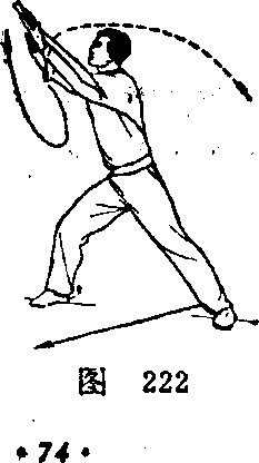 (-)左手接握刀柄,右手松开 刃柄变掌,右臂外旋,使右掌心朝上3 左手随即握刀,左臂略屈肘回收,而 后经右腕内侧将刀柄向右上穿出,右 臂略屈,右掌略向左绕行回收,目视 刀柄。(图222)