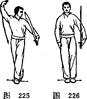 (二) 右脚后撤一步;右臂 向后上方弧形举起,使掌心翻转 朝前,掌指朝上:目视左方。(图 225)
