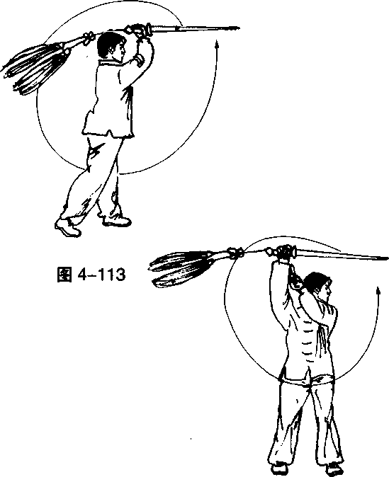 当动作做到图4-112时,上体左转;同时,右手握剑臂外 旋,使剑向下、向前上撩,手心向右,剑尖向前;左剑指仍附 于右腕内侧;目视前方。(图4-113)■飞花长穗剑*■?图M■飞花长穗剑*■?图M动作不停,上体右转;右手握剑,臂向里旋,使剑在身体 ■飞花长穗剑*■?图M■飞花长穗剑*■?图M左侧向后、向下、向前上撩于头上方,手心向前,剑尖向前;左剑指附于右前臂内侧;目视左前方。(图4-114)如此连续做三个,方法与图4-112~114动作相同。要点:以肩为轴,在身体两侧绕立圆,动作快速连贯。