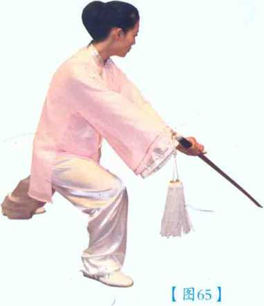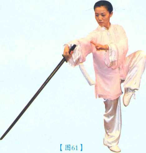 左腿屈膝成右独立步,上体略右转;同时右手握剑经上向右前下方点剑,剑尖与 膝同高;左手剑指屈肘右摆,附于右前臂内侧,手心朝下;目视剑尖方向。(见图61)