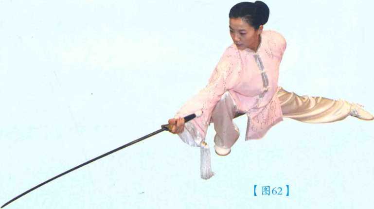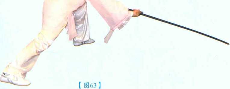 2 .随身体重心左移,身体左转(约 90° ),左腿屈膝,脚尖外展,右脚跟外 展碾步成左弓步;同时右手握剑,向左平 扫,腕同腰高,手心朝上,臂微屈,剑 尖朝前下方略低于腕;左手剑指经左向 上,臂呈弧形举于头上方,手心朝上;目 视剑尖方向。(见图63)