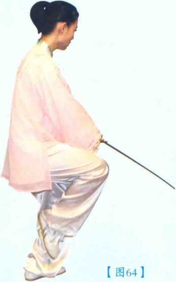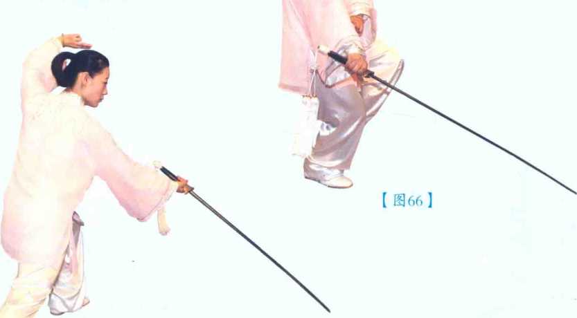 1 .身体重心前移,右脚跟至左脚内 侧(脚不触地);同时右手握剑内旋划弧 拨剑,腕同腰高,手心朝下,剑尖朝左前 下方;左手剑指屈肘下落附于右腕内侧, 手心朝下;目视剑尖方向,(见图64)