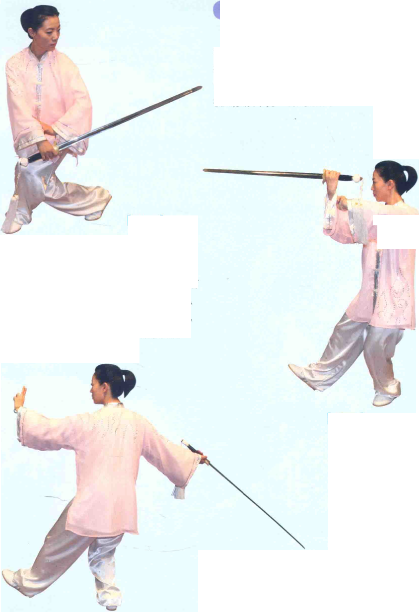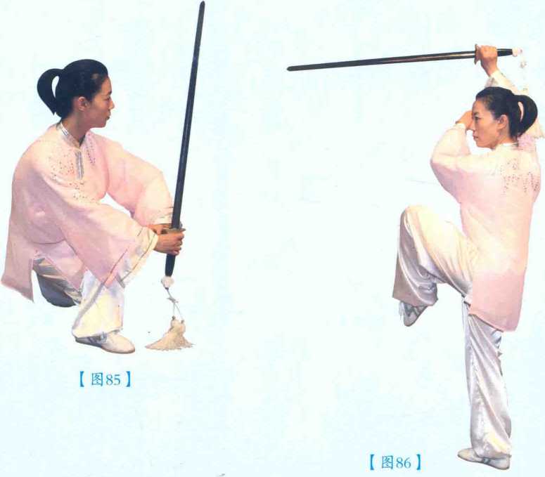 要点:插步转体时,上体不要过于前俯和突臀;提膝与上举剑要协调一致;此势 为平衡动作。