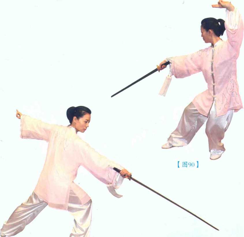 1.右脚跟内扣踏实,屈膝半蹲;左脚跟提起,身体重心前移,上体右转;同时 右手握剑跷腕向后带剑至右胯旁,手心朝内,剑尖朝左上方,略低于肩;左手剑指屈 肘下落附于右腕上,手心朝下;目视右前下方。(见图91)