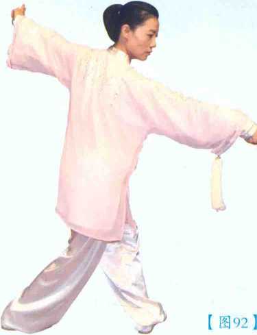 2、左脚向左落步,成左弓步,上体 略向左倾;同时右手握剑向前上方探刺; 左手剑指向右与右臂在体前相合,附于右 前臂内侧;目视剑尖方向。(见图95)