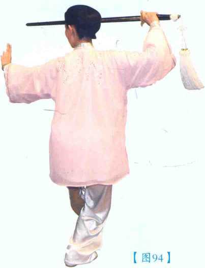 1 .随身体重心后移,身体右转,左脚 尖内扣;同时右手握剑屈肘回带至左肩前, 手心朝内,剑尖朝右;左手剑指附于右腕 内侧;手心朝外;目视右侧。(见图96)