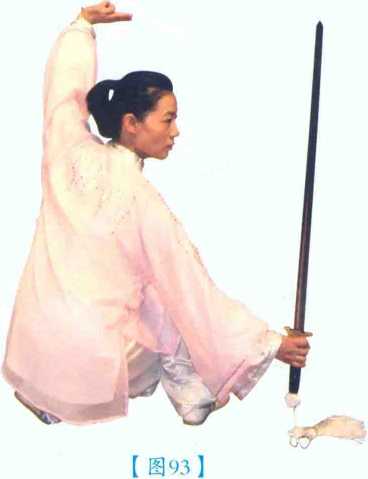3.重心后移,右脚向左脚后撤步成 歇步;身体略右转;同时右手握剑,变虎 口朝上后沉腕崩剑,腕同腰高;左手剑指 向上,臂呈弧形举于左上方,手心斜朝 上;目视右前方。(见图93)